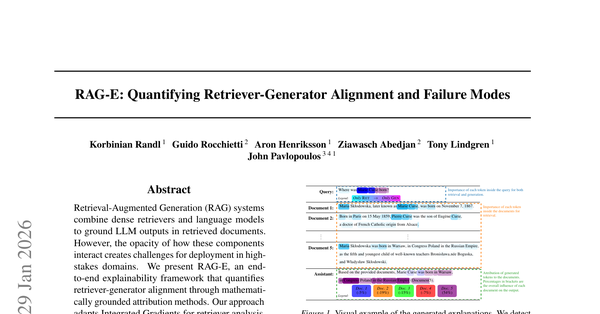 検索拡張生成(RAG)システムっていうんは、密なベクトル検索器と言語モデルを組み合わせて、LLMの出力を検索してきた文書に基づかせる仕組みやねん。せやけど、この2つの部品がどないに連携してるんかがブラックボックスやから、医療とか法律みたいな重要な分野で使うときに困るわけや。ほんで俺らが提案するんがRAG-Eっていう、端から端まで説明できるフレームワークやねん。数学的にちゃんと根拠のある帰属手法を使って、検索器と生成器がどれくらいうまく連携してるかを数値化するんや。俺らのアプローチでは、検索器の分析用にIntegrated Gradientsっていう手法を適応させて、生成器の帰属分析にはPMCSHAPっていうモンテカルロ法で安定化させたシャプレイ値の近似手法を新しく導入してるねん。ほんで、Weighted Attribution-Relevance Gap(WARG)っていう指標も新たに提案して、生成器の文書の使い方が検索器のランキングとどれくらい一致してるかを測れるようにしたんや。TREC CAsTとFoodSafeSumっていうデータセットで実験したら、えらいこっちゃな結果が出てきてん。クエリの47.4%から66.7%で、生成器が検索器のトップランクの文書をガン無視してることがわかったんや。さらに48.1%から65.9%では、関連性が低いってランク付けされた文書に頼ってしもてるねん。こういう失敗パターンを見ると、RAGの出力品質っていうんは個々の部品の性能だけやなくて、その連携具合にかかってるっていうことがわかるわけや。ほんでその連携具合をRAG-Eで監査できるっちゅうわけやねん。