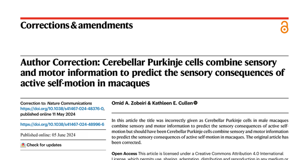 この論文な、タイトルがちょっと間違っとってん。もともと「オスのマカクザルの小脳プルキンエ細胞が感覚情報と運動情報を組み合わせて能動的な自己運動の感覚的結果を予測する」ってなっとったんやけど、正しくは「小脳プルキンエ細胞が感覚情報と運動情報を組み合わせてマカクザルにおける能動的な自己運動の感覚的結果を予測する」やねん。要するに「オスの(male)」って言葉が余計に入っとって、しかも「マカクザル(macaques)」の位置もちょっとズレとったんやな。元の論文はもう修正済みやで。
